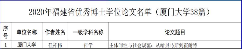 日前,福建省学位委员会正式公布了2020年福建省研究生优秀学位论文评选结果,全省各高校共有75篇学位论文获评省级优秀博士学位论文。其中,我中心徐梦秋教授指导的博士生任祥伟同学,其学位论文《主体间性与社会规范:从哈贝马斯到霍耐特》获评2020年度福建省优秀博士学位论文。