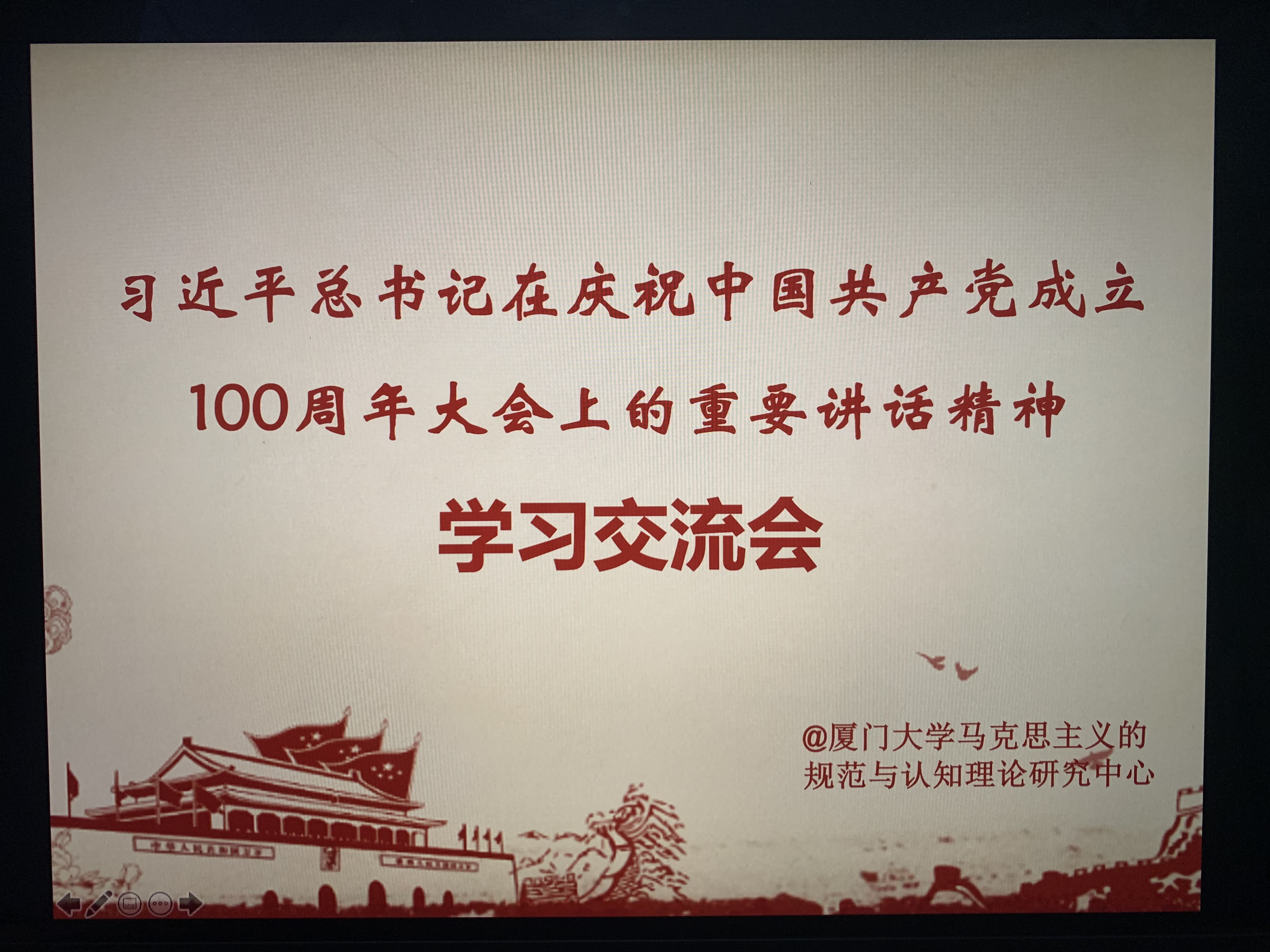 会议现场气氛热烈,中心成员踊跃发言,在深入学习贯彻习近平总书记“七一”重要讲话精神的过程中,重温党的奋斗历程与伟大成就,感悟党的光荣传统与优良作风,传承党的历史经验与时代使命。未来,厦门大学马克思主义的规范与认知理论研究中心将继续相应习近平总书记代表党中央发出的伟大号召,深化对中国共产党是中国特色社会主义事业领导核心的认识与理解,为奋力谱写全面建设社会主义现代化国家的福建篇章贡献社科智慧!