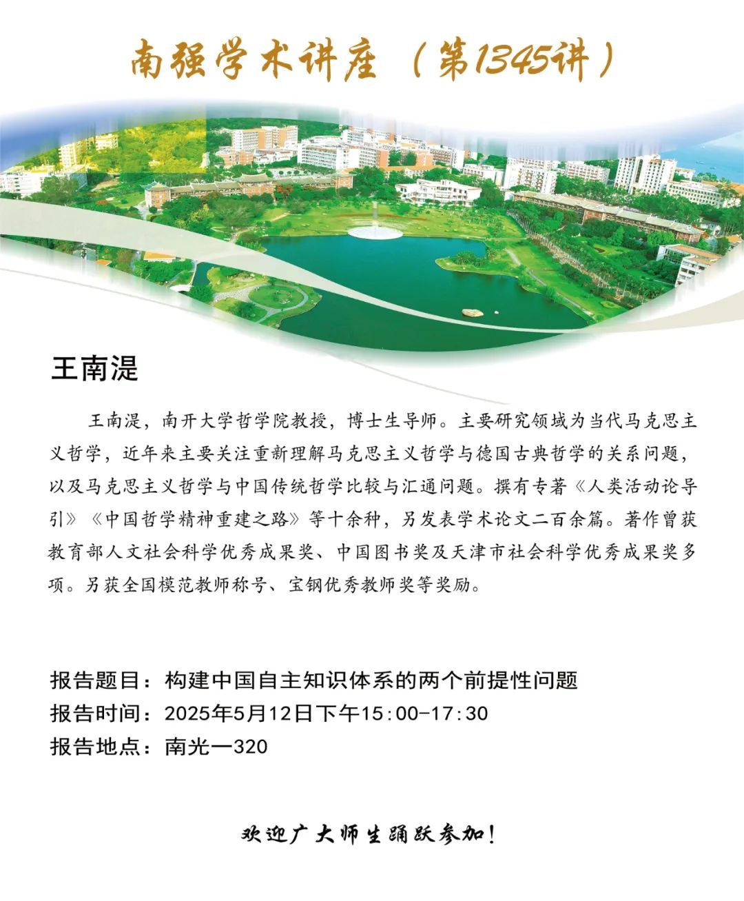 王南湜,南开大学哲学院教授,博士生导师。主要研究领域为当代马克思主义哲学,近年来主要关注重新理解马克思主义哲学与德国古典哲学的关系问题,以及马克思主义哲学与中国传统哲学比较与汇通问题。撰有专著《人类活动论导引》《中国哲学精神重建之路》等十余种,另发表学术论文二百余篇。著作曾获教育部人文社会科学优秀成果奖、中国图书奖及天津市社会科学优秀成果奖多项。另获全国模范教师称号、宝钢优秀教师奖等奖励。